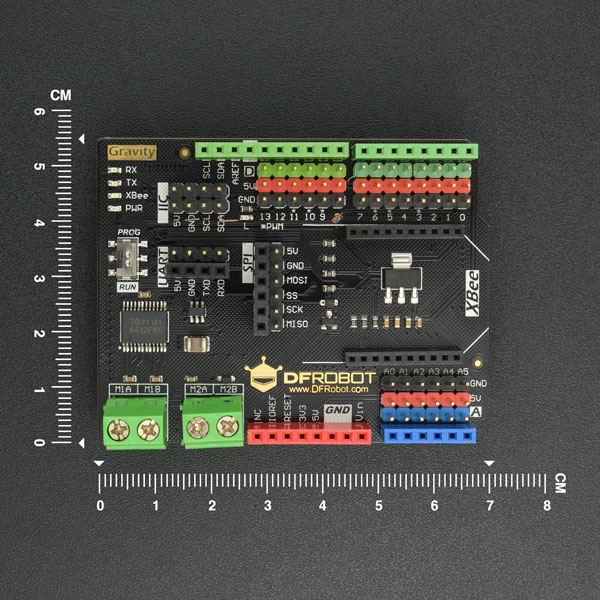 Gravity: IO Expansion & Motor Driver Shield是一块与Arduino兼容的扩展板。除了引出Arduino的通用引脚外,扩展板还为每一个管脚单独配备了VCC和GND端口,方便了传感器的接插。此外扩展板还预留了IIC接口、串口、Xbee插槽等丰富接口资源,可以更加方便地外接设备。
